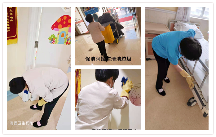 每天为保持我院的良好卫生环境默默无闻的尽一份力,在这平凡之中蕴藏着无私与奉献 。 她们不怕苦 、不怕累 、把医院的每一个地方都打扫的干干净净,从不放过一处角落,从不落下一丝灰尘,没有死角,这是勤劳伟大的保洁阿姨辛勤劳动的结晶。